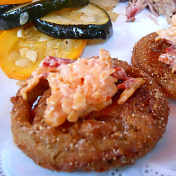 I was really surprised by how easy these were to make. I fried them in my cast iron skillet. It was relatively painless and didn’t leave the house smelling “fried.” I was very pleased with the final result – the tomatoes were perfectly crispy on the outside and had a great texture on the inside. The pimento cheese topping really took them up another notch!