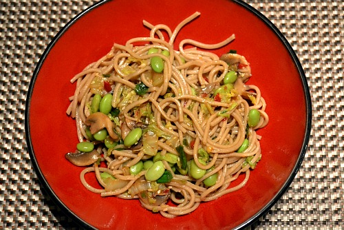 Spicy Soba Noodles with Edamame, Mushrooms and Cabbage