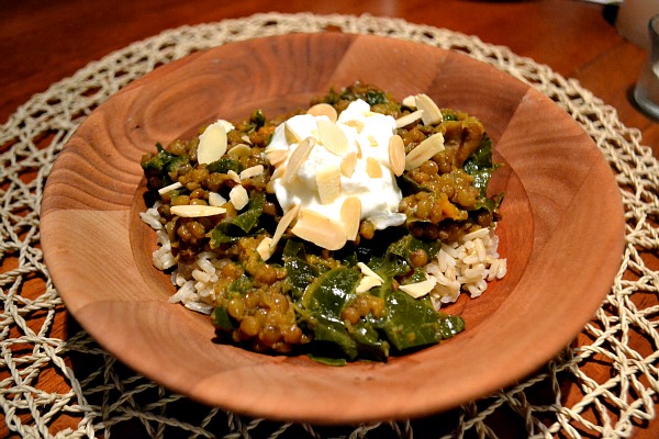I served the curry over brown rice and topped it with plain Greek yogurt and a sprinkle of almonds. The Greek yogurt was a nice touch to cool it down a bit (I was a little heavy handed with the cayenne pepper – I love spice!). I can only imagine that the leftovers will be even better after the flavors have a chance to develop even more with time.